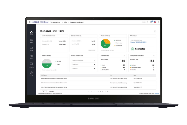 Samsung LYNK Cloud ofrece una solución basada en la nube y completamente escalable para monitorear, gestionar y mantener toda su flota de televisores en las habitaciones de los huéspedes.